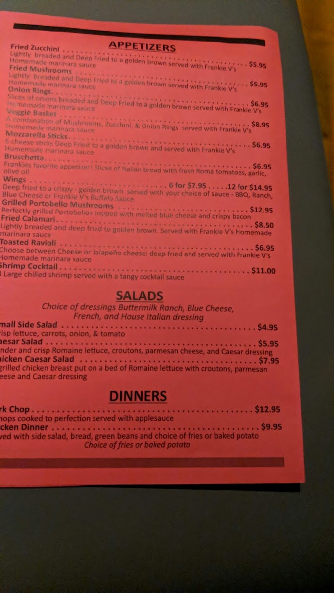 “ Had dinner last night at Frankie V’s. First time there, had always passed this place and wondered how it would be. Well shame on me, should have been here a long time ago. Food was fantastic, service was great and it’s very friendly. It’s very nostalgic on the inside which added to the ambiance. Could not believe the wine selections they had. Full bar, IPA on tap. I can’t say enough about our experience. Definitely going to be one of our return to frequently favorites. The owner is great, she spoke with us and the cook came out to ask how we enjoyed our meal. We highly recommend. ”